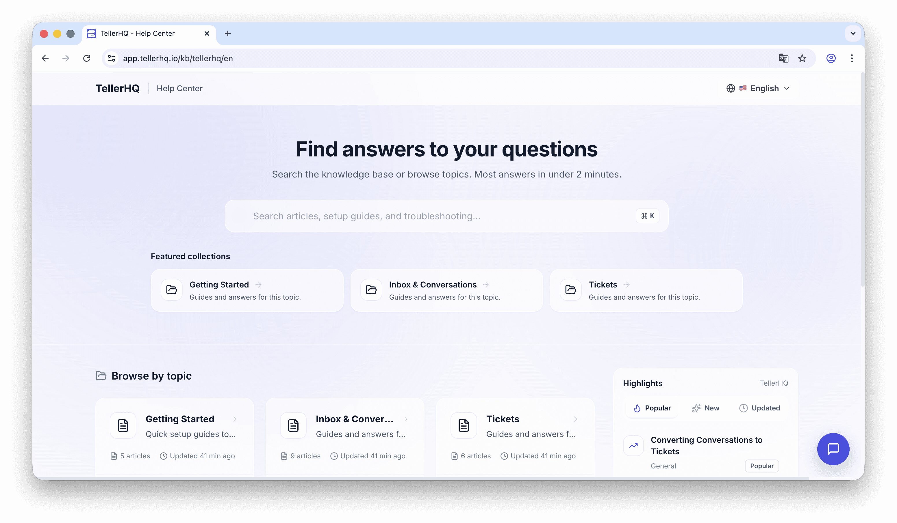 Add the widget, publish your knowledge base, and handle conversations and tickets from a single inbox, across all your products.